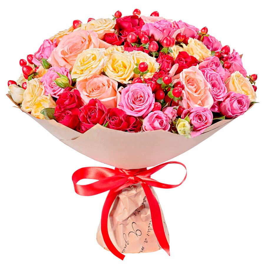 Роза одноголовая розовая, роза кустовая микс (красная, розовая, кремовая), гиперикум. Упаковка (лента, пленка, крафт, сетка, пленка матовая)