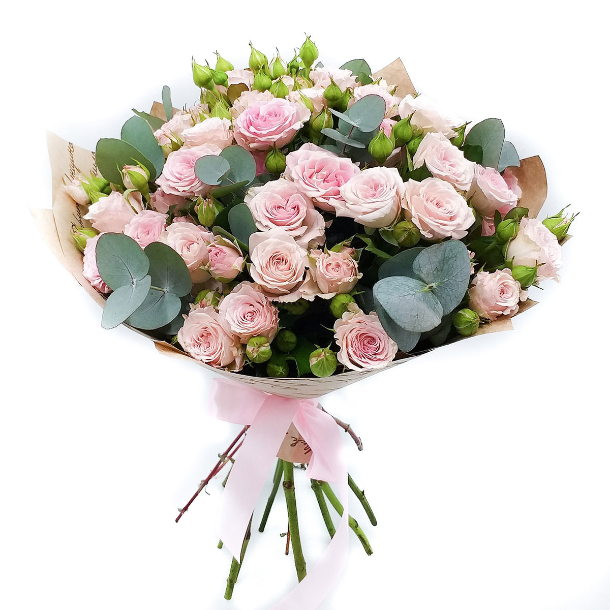 Роза кустовая эквадор розовая, эвкалипт. Упаковка (лента, пленка, крафт, сетка, пленка матовая)