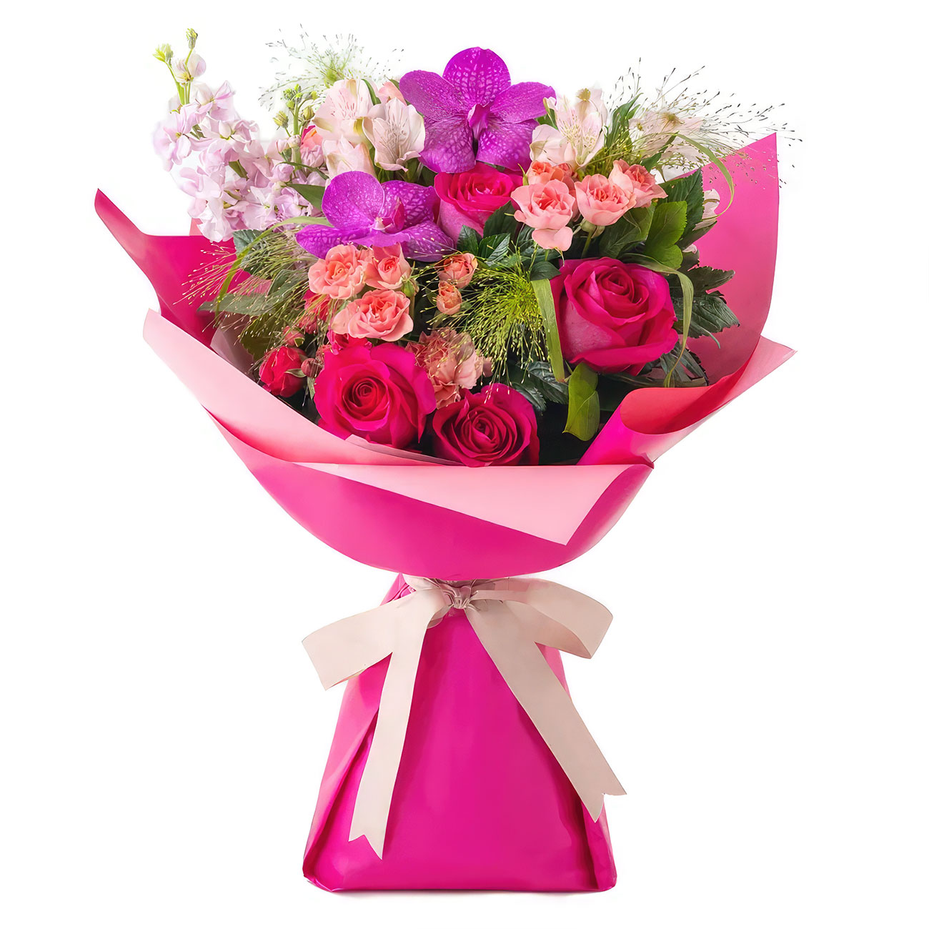 Роза одноголовая розовая, роза кустовая розовая, орхидея ванда сиреневая, альстромерия розовая, маттиола нежно-розовая, рускус, зелень. Упаковка (лента, пленка, крафт, сетка, пленка матовая)