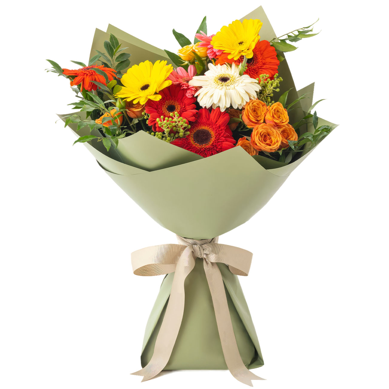 Гербера красная, желтая, белая, роза кустовая оранжевая, салал, фисташка, зелень. Упаковка (лента, пленка, крафт, сетка, пленка матовая)