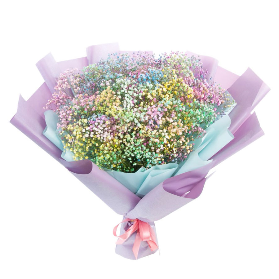 Гипсофила розовая, белая, голубая, желтая, зеленая. Упаковка (лента, пленка, крафт, сетка, пленка матовая)