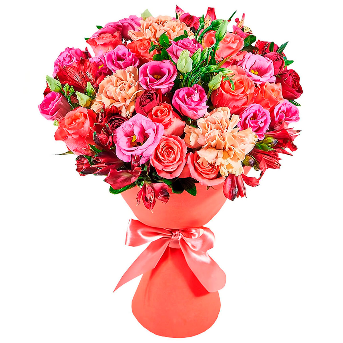 Роза одноголовая коралловая, альстромерия красная, эустома розовая, гвоздика персиковая. Упаковка (лента, пленка, крафт, сетка, пленка матовая)