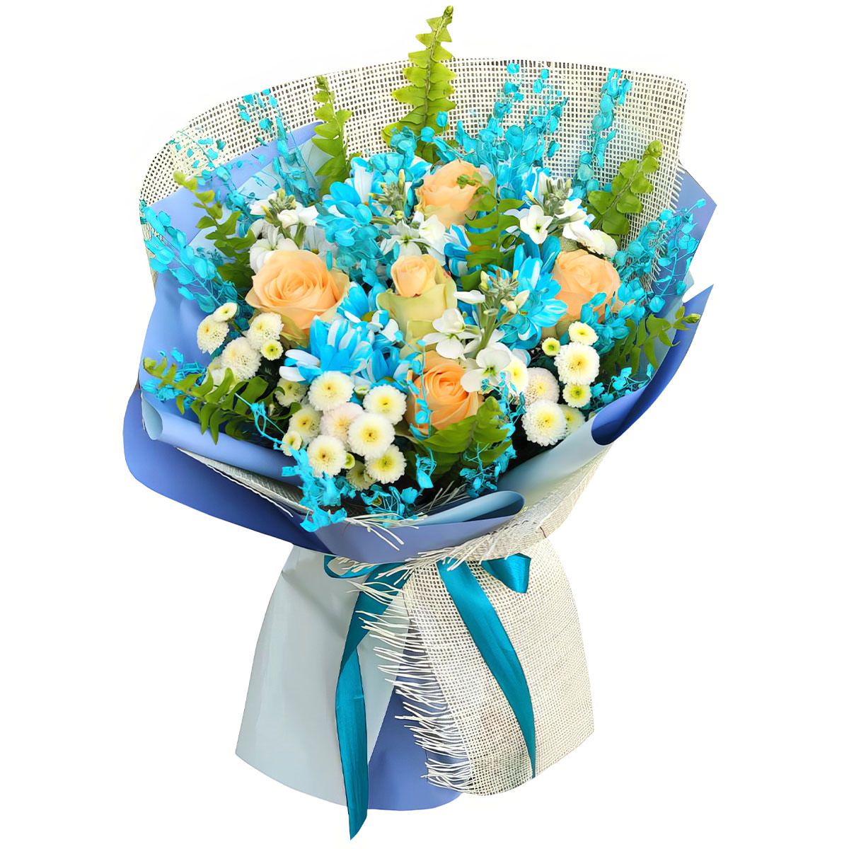 Роза одноголовая кремовая, маргаритка мини белая, лунария голубая. Упаковка (лента, пленка, крафт, сетка, пленка матовая)