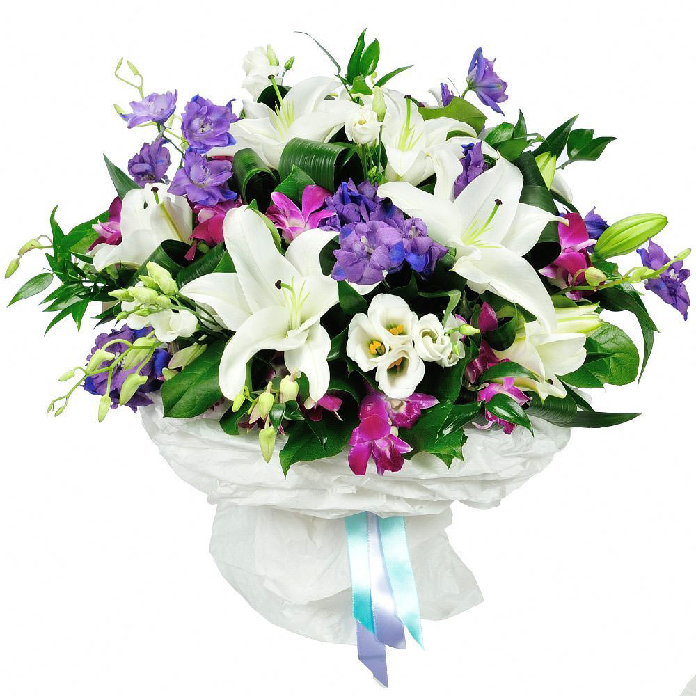 Лилия белая, эустома белая, аспидистра, маттиола фиолетовая, орхидея дендробиум сиреневая. Упаковка (лента, пленка, крафт, сетка, пленка матовая)