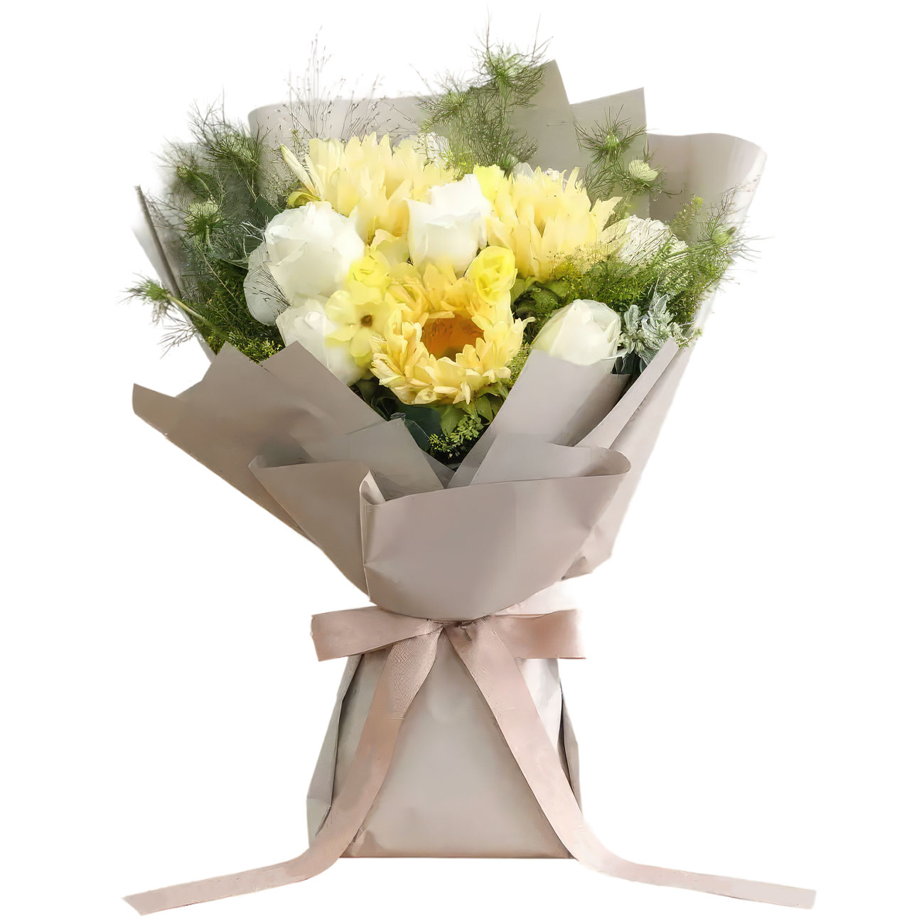 Подсолнух, лютик бабочковый, роза одноголовая белая, нигелла, паникум фонтанный, тласпи. Упаковка (лента, пленка, крафт, сетка, пленка матовая)