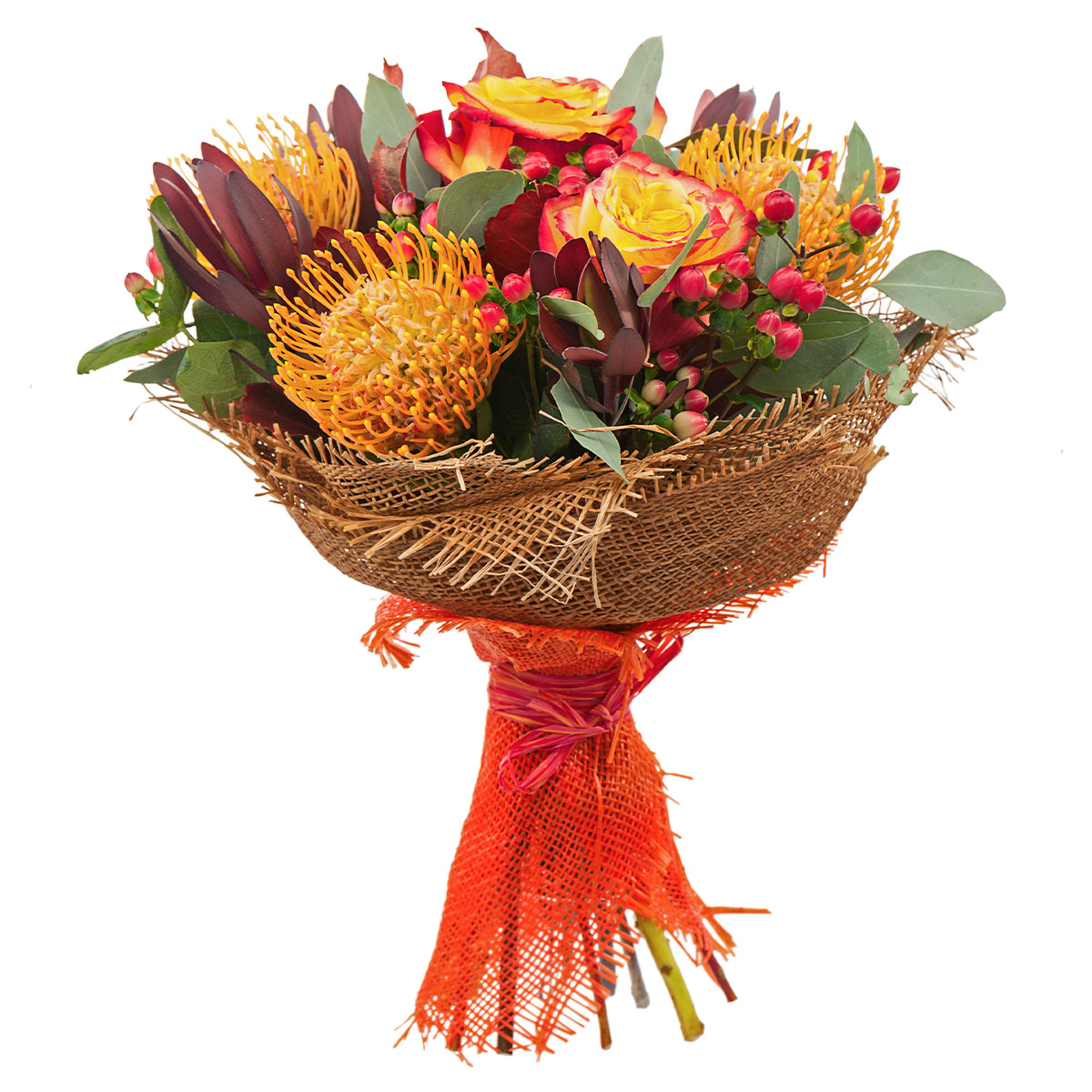 Роза одноголовая желтая, леукоспермум, гиперикум, эвкалипт. Упаковка (лента, пленка, крафт, сетка, пленка матовая)