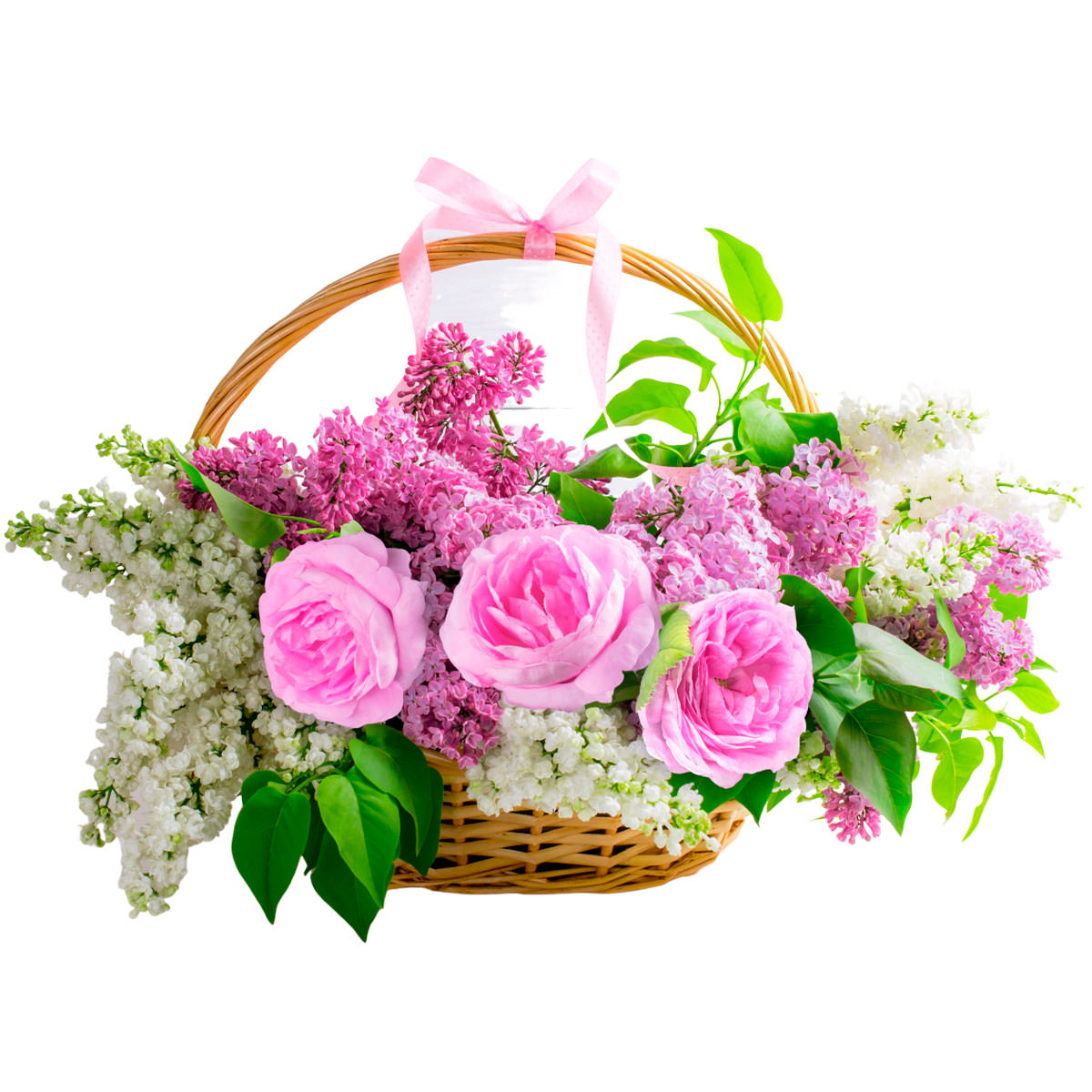 Роза одноголовая розовая, сирень белая и розовая. Упаковка (Корзина, оазис, ящик).