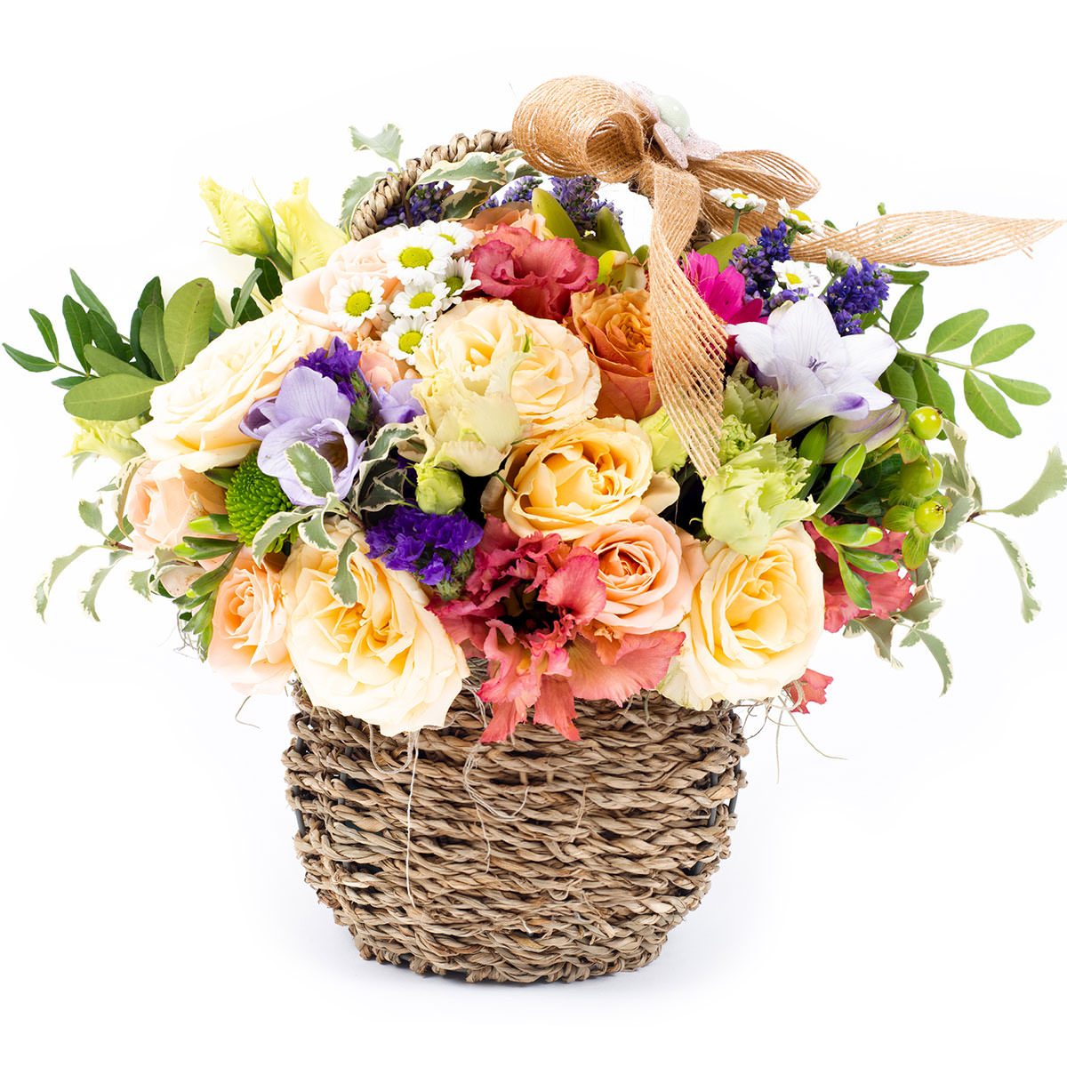 | Состав | Розы, Ромашки, Танацетум, Фрезии, Хризантемы, Эустомы |