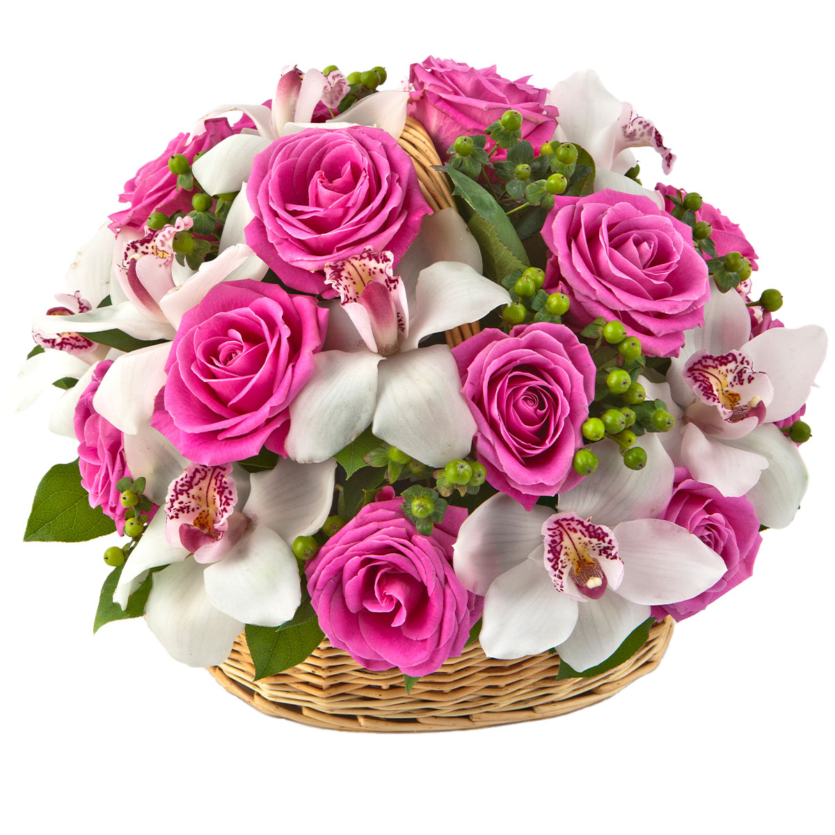 Роза одноголовая розовая, орхидея белая, гиперикум. Упаковка (Корзина, оазис, ящик).