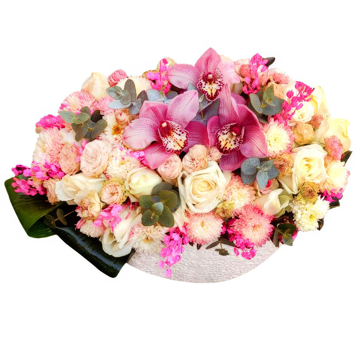 Орхидея розовая, роза одноголовая кремовая, роза кустовая пионовидная кремовая, хризантема кустовая розовая, аспидистра. Упаковка (Корзина, оазис, ящик).