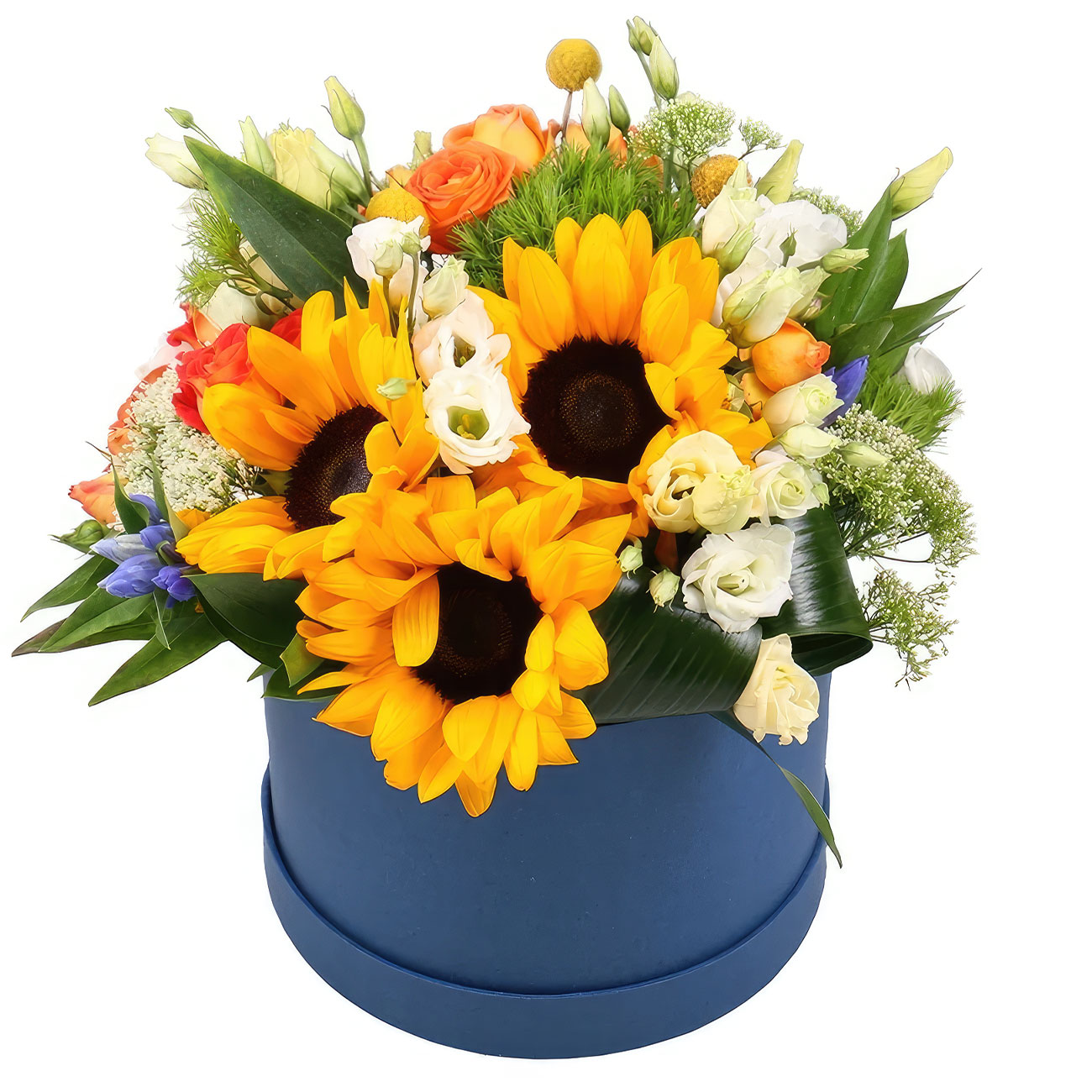 Цветы в коробке «Подсолнечное настроение» с доставкой по г Киров (Калужская обл): вы можете купить букет в цветочном супермаркете «Флормания» по цене от 2890 руб.