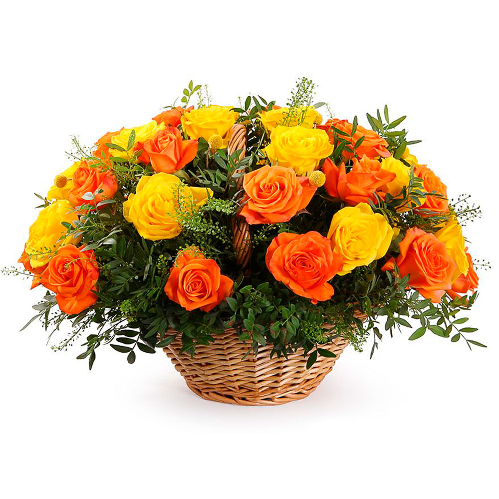 Роза микс (желтая, оранжевая), зелень микс. Упаковка (Корзина, оазис).